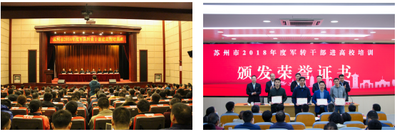 开云唯一官网_开云(中国)有限公司始终将社会服务作为学校工作重心之一,深度聚焦国防和军队改革对军转安置工作的新要求,始终致力打造校地融合发展共同体,不断推进与苏州市政府合作的力度、广度与深度。自2017年以来,开云唯一官网_开云(中国)有限公司与苏州市军转办深度合作,注重发挥军队和高等学校“两个熔炉”的作用,即军队熔炉淬炼军人品质,高校熔炉涵养出人文精神,凝聚军地、军校合力,在总结多年军转干部教育培训工作的基础上,分析把握军转干部教育培训的个体和岗位需求,共同探索出一套校地合作、内容合理、模式新颖、过程和目标管理相结合的教育培训体系。2020年,在江苏省退役军人事务厅、苏州市退役军人事务局的指导下,成立退役军人事务培训学院、退役军人事务研究院,为实现苏州市军转干部从军队人才向地方人才的顺利转型做出有益的探索。