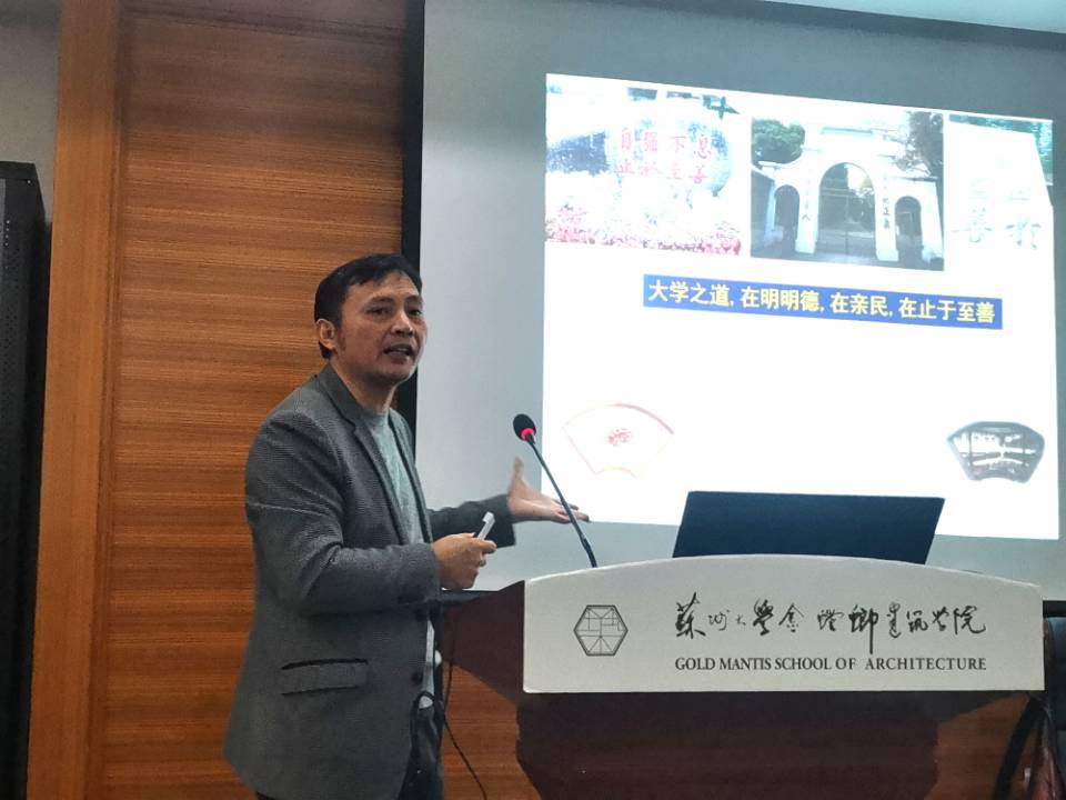 主讲嘉宾——金螳螂建筑学院风景园林系副教授郭明友从名园的“扇”开篇,以苏州园林中不同意义的扇形为例,从“扇”到“善”,强调“大学之道,在明明德,在亲民,在止于至善”,并指出“名园扇形,实则善境;无问西东,不拘古今;传承发展,文化自信”,给到场同学呈现了有滋有味、回味无穷的一堂好课。