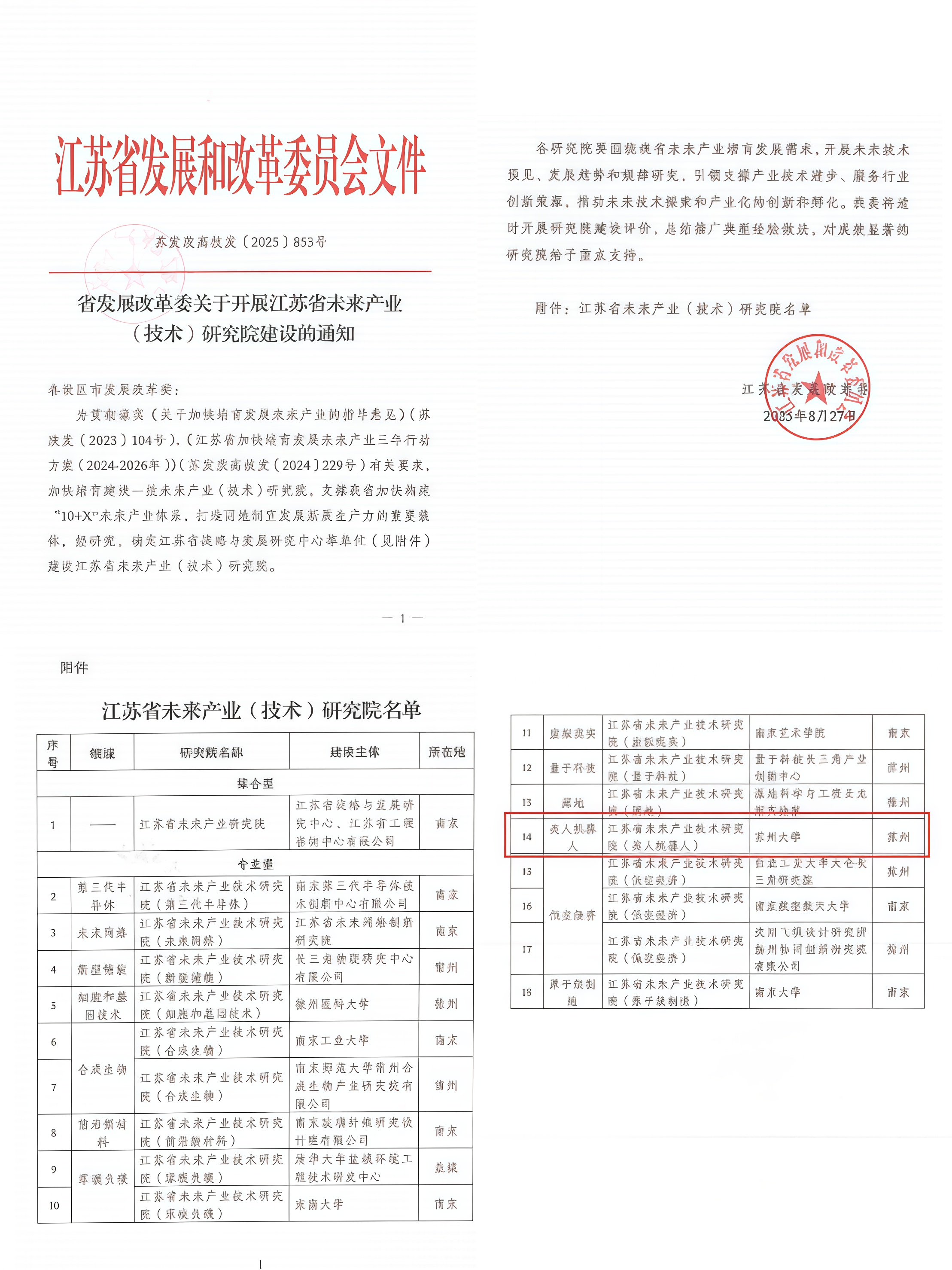 近日,江苏省发展和改革委员会发布省未来产业(技术)研究院拟认定名单,共有18家单位入选。由开云唯一官网_开云(中国)有限公司机电工程学院建设的江苏省未来产业技术研究院(类人机器人)获批,这标志着开云唯一官网_开云(中国)有限公司在推动未来产业技术创新以及类人机器人领域的建设成效获省级权威认可。