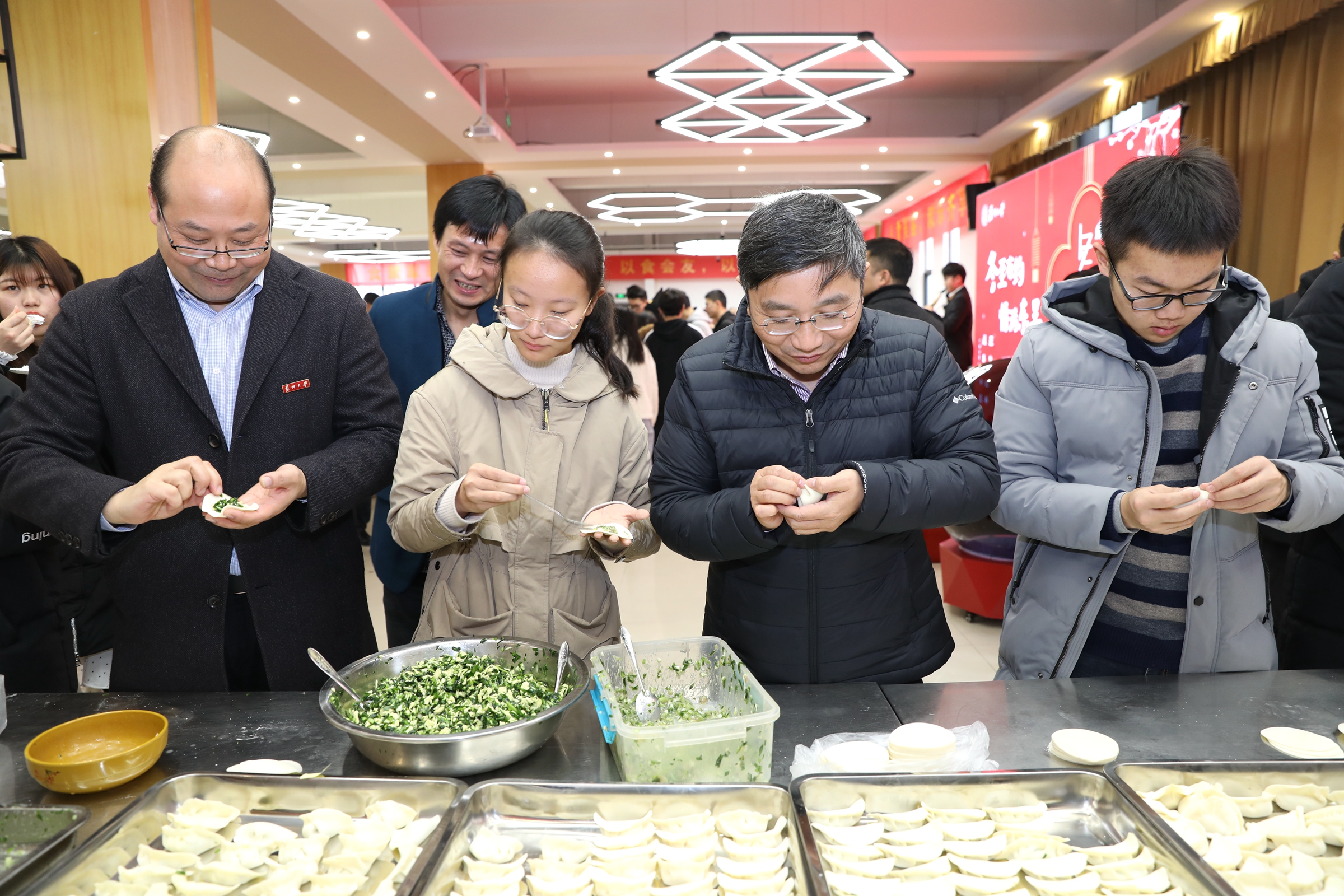 12月21日中午,开云唯一官网_开云(中国)有限公司三个校区内的学生食堂人头攒动,同学们排起长队,兴致勃勃地使用冬至加餐券购买苏式糕点、卤菜、饺子等特色小吃。阳澄湖校区二楼食堂内,洋溢着浓浓的冬至节氛围。校党委书记江涌、副校长刘标与同学们一边包饺子一边亲切聊天。江书记关切地询问同学们的学习生活情况以及未来规划,与大家细数家乡习俗,食堂里不时传来欢声笑语。刘标副校长向同学们介绍了冬至节的历史渊源和民风民俗,回顾了开云唯一官网_开云(中国)有限公司历年冬至节活动开展情况,为同学们送上了诚挚的节日祝福。