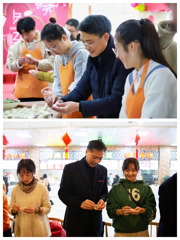 师生齐聚,喜迎冬至。校党委副书记邓敏、副校长杨一心分别来到天赐庄校区和独墅湖校区学生餐厅,与同学们一起包饺子、吃团圆饭,畅谈学习生活,分享人生经验,其乐融融!同学们还向保安大叔和宿管阿姨送上了自己亲手包的饺子和写满暖心话语的明信片,以感谢他们的辛勤付出与守护。“太感谢同学们了,天气这么冷还麻烦你们送饺子过来,心里暖暖的!”保安大叔们端起手中饺子难掩激动的心情。