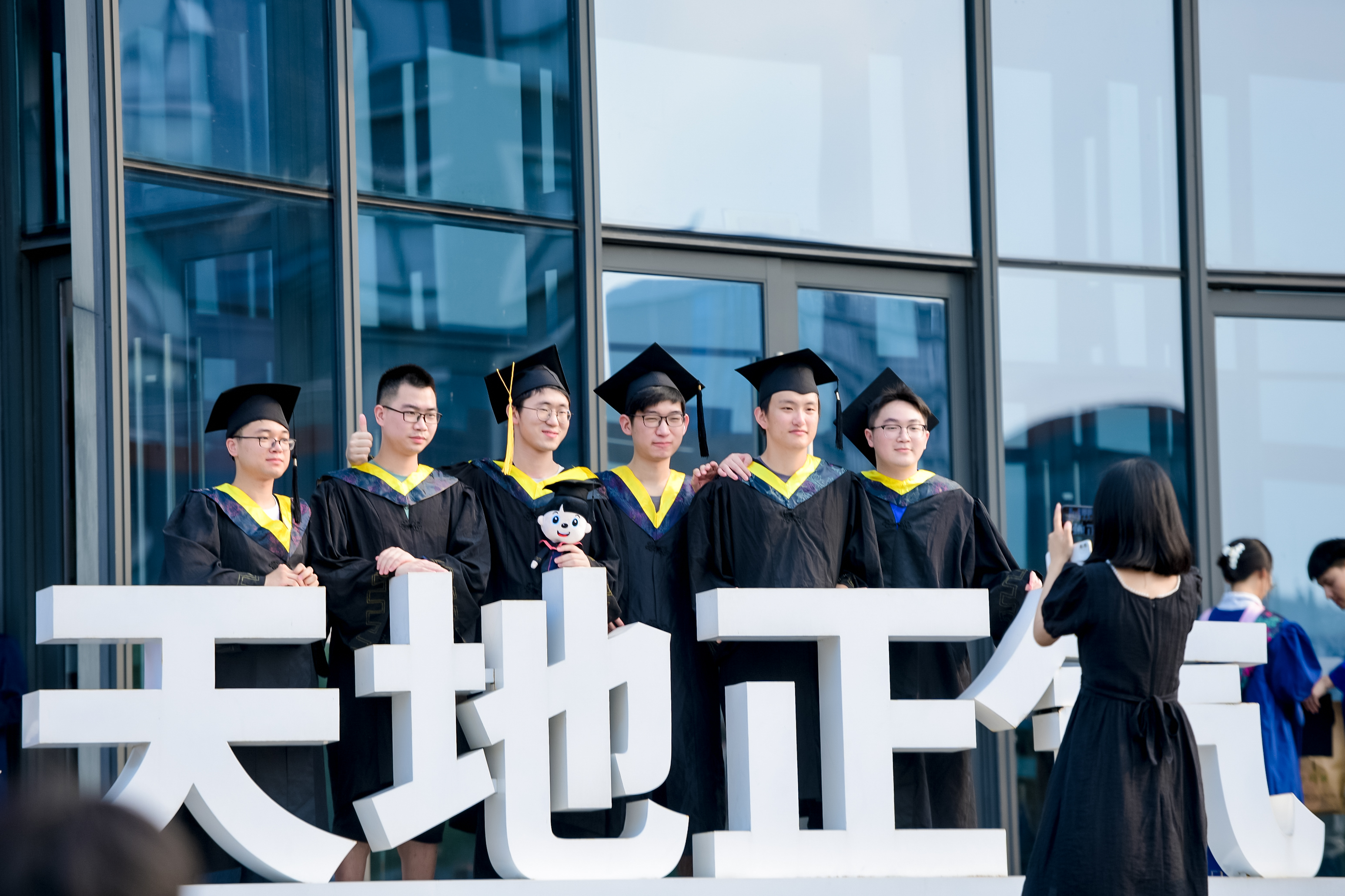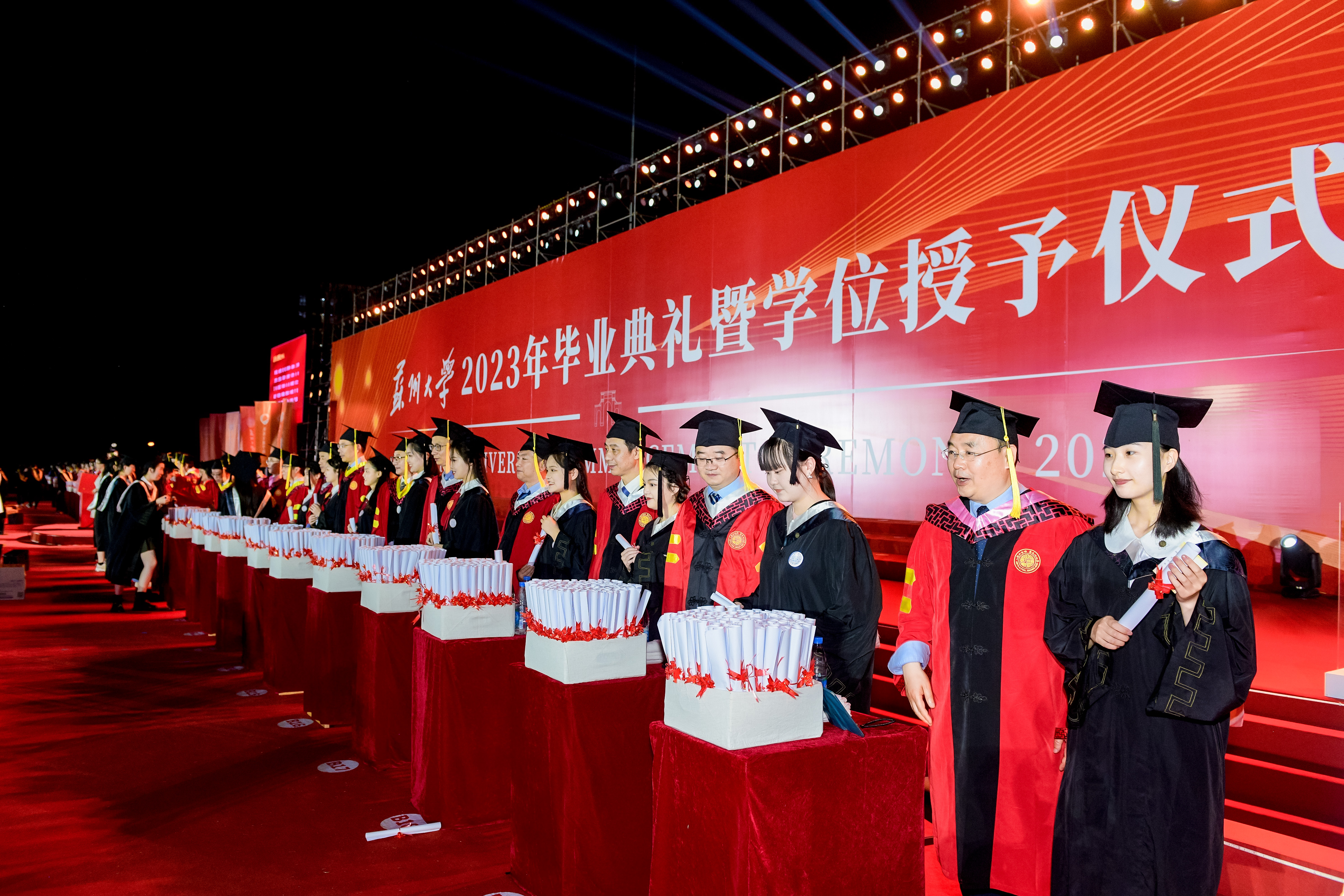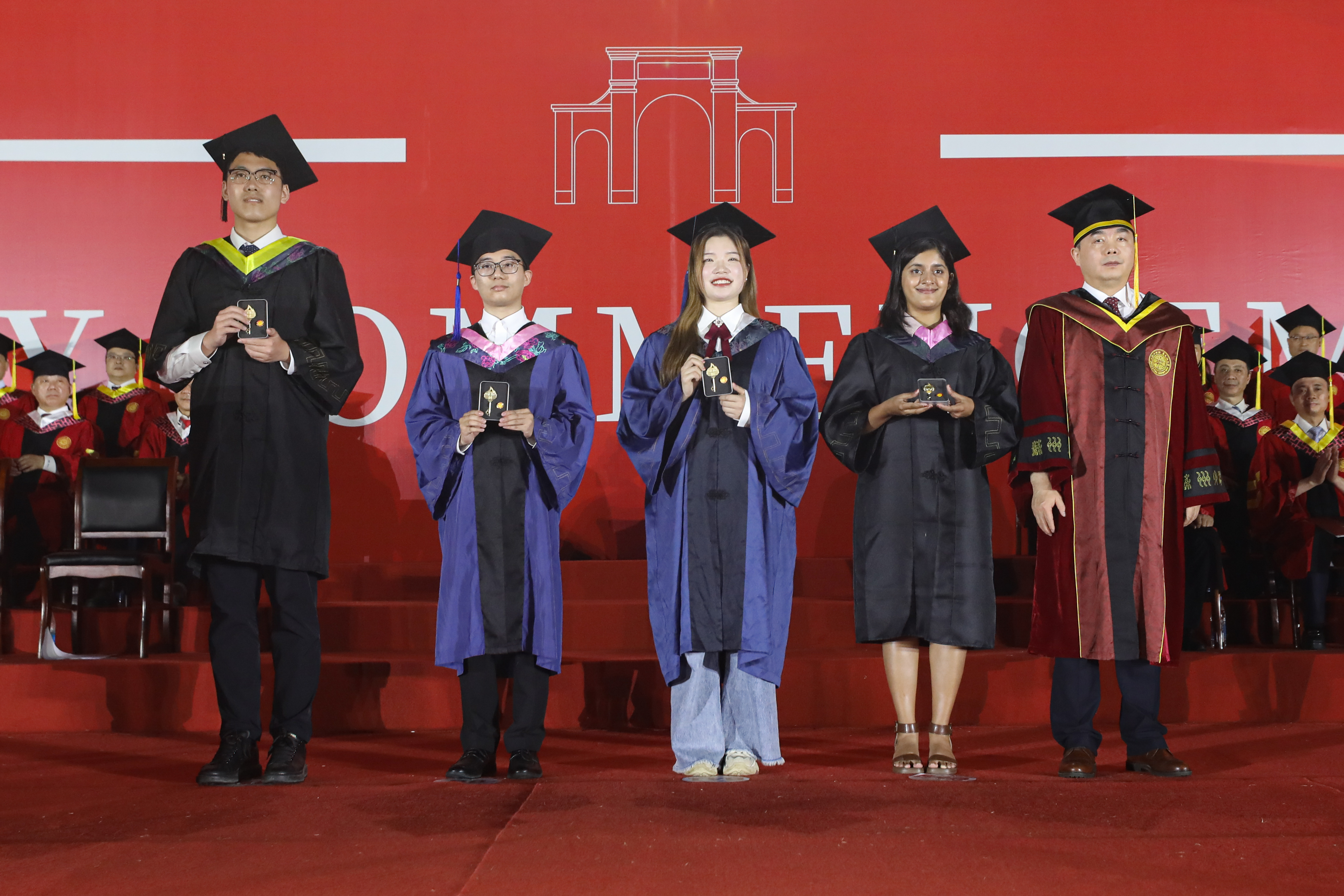 在学位授予仪式上,毕业生们身着学位服,80人一组依次登台,主礼教授为学位获得者授予学位证书、扶正流苏,并合影留念。