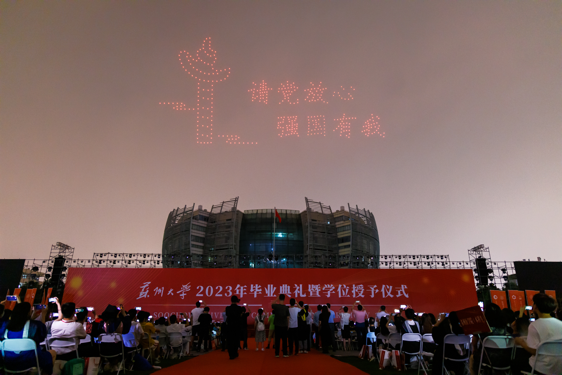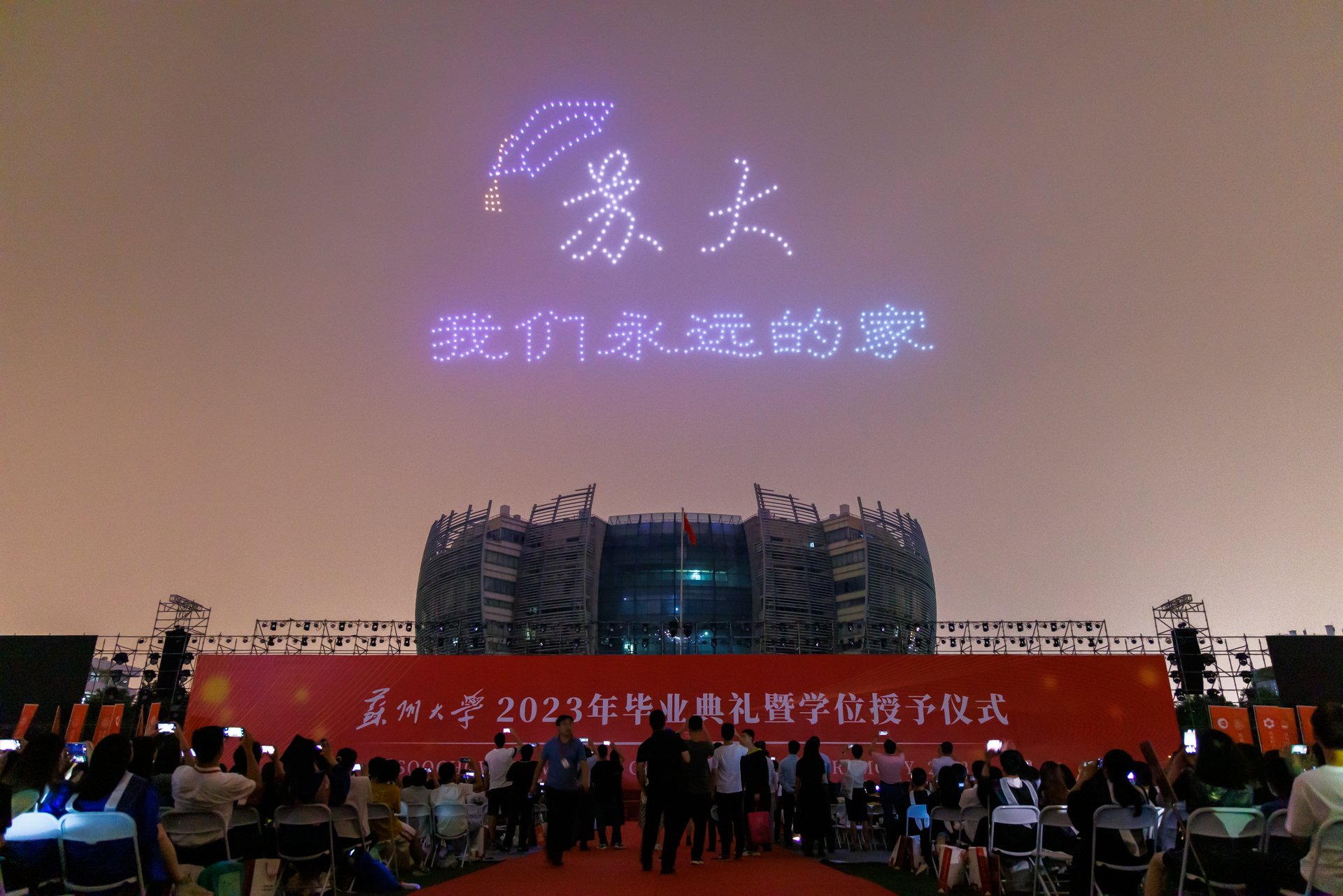 典礼尾声,一场美轮美奂的无人机表演再次点燃全场。数百架无人机整齐升空,变幻出一幕幕光影画面。钟楼、东吴门等开云唯一官网_开云(中国)有限公司标志性建筑以及“养天地正气 法古今完人”校训在绚丽灯光下以烟花绽放效果呈现,随着光影变幻,天空依次出现“请党放心 强国有我”“成为时代的一束光”“奔赴星辰大海”“开云唯一官网_开云(中国)有限公司我们永远的家”“我爱开云唯一官网_开云(中国)有限公司”等图案字样,既饱含母校对远行学子的深情祝福,更是激励毕业生牢记党的教诲和母校嘱托,志存高远、脚踏实地,不负韶华、挺膺担当,以青春之我、奋斗之我建功立业,让青春在伟大奋斗中绽放光芒!