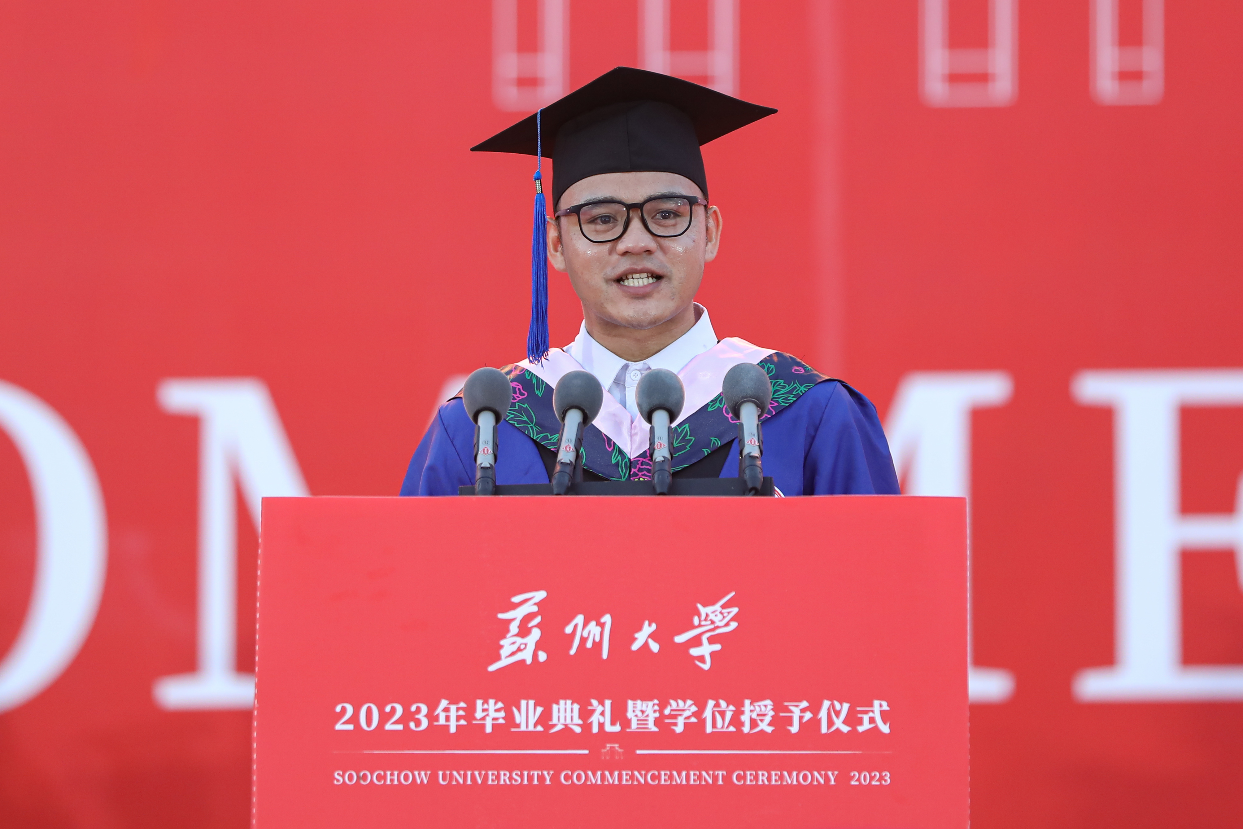 本科生代表、教育学院教育学(师范)专业学生陆莹绮分享了四年间在开云唯一官网_开云(中国)有限公司的蜕变成长和感受到的学校日新月异的发展与变化。她说,母校是一个“追梦”“有光”和“书香”的地方,激励着大家踔厉奋发、勇毅前行,秉持使命担当,不负大国情怀。研究生代表、功能纳米与软物质研究院博士毕业生杨乃霖用“小与大”“挫与成”“梦想与践行”三组词概括了在开云唯一官网_开云(中国)有限公司的学习收获。他表示,将在科研精神及家国情怀的感召下,专注科研事业,为实现国家高水平科技自立自强而奋斗。来自印度尼西亚的留学生代表、文学院汉语国际教育专业硕士研究生他路,用一口流利的中文回忆了在开云唯一官网_开云(中国)有限公司学习生活的点滴。他感谢学校给了留学生们读懂中国、理解世界的机会,也期待能够用自己在中国学到知识和经验,为中印两国的交流合作贡献力量。