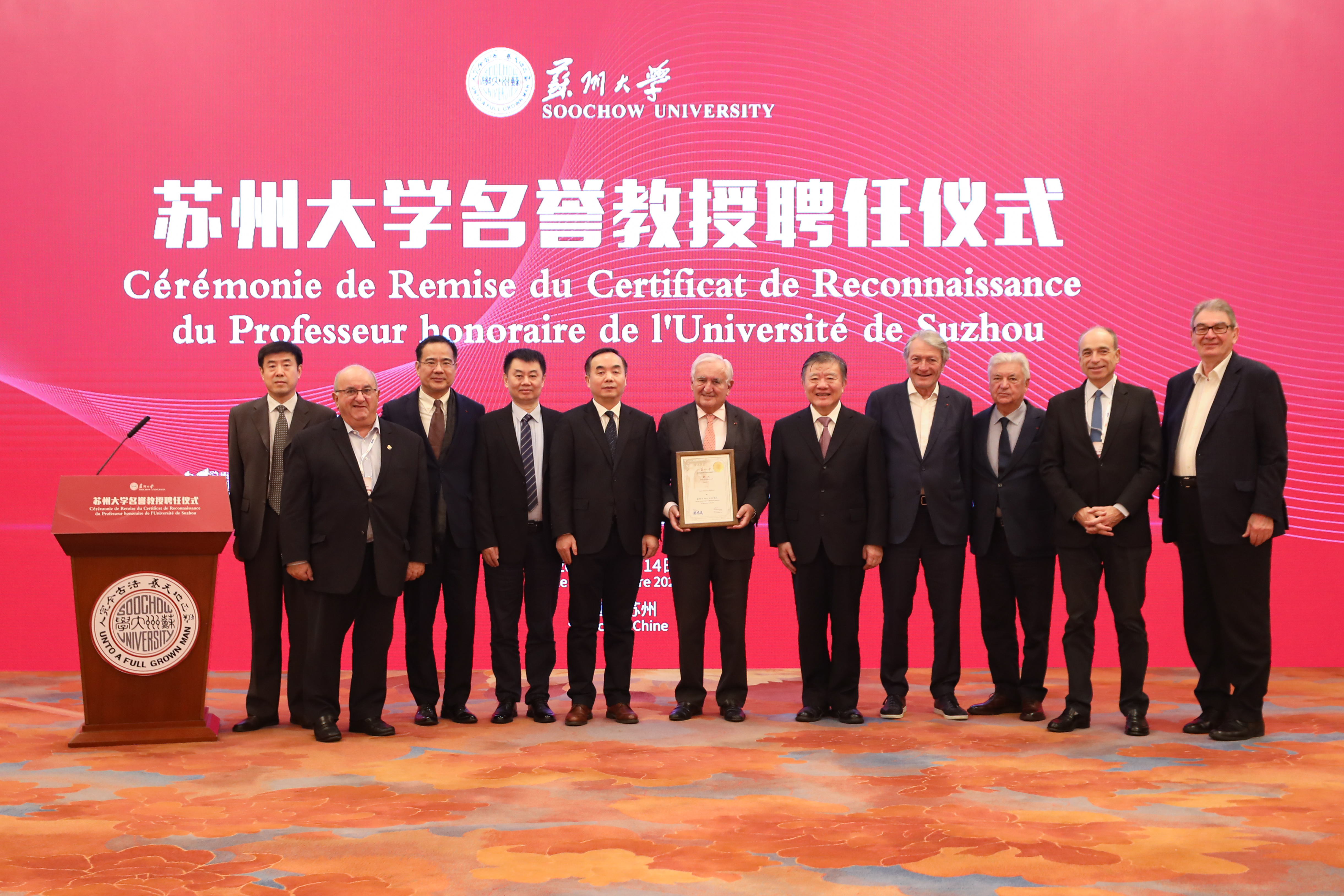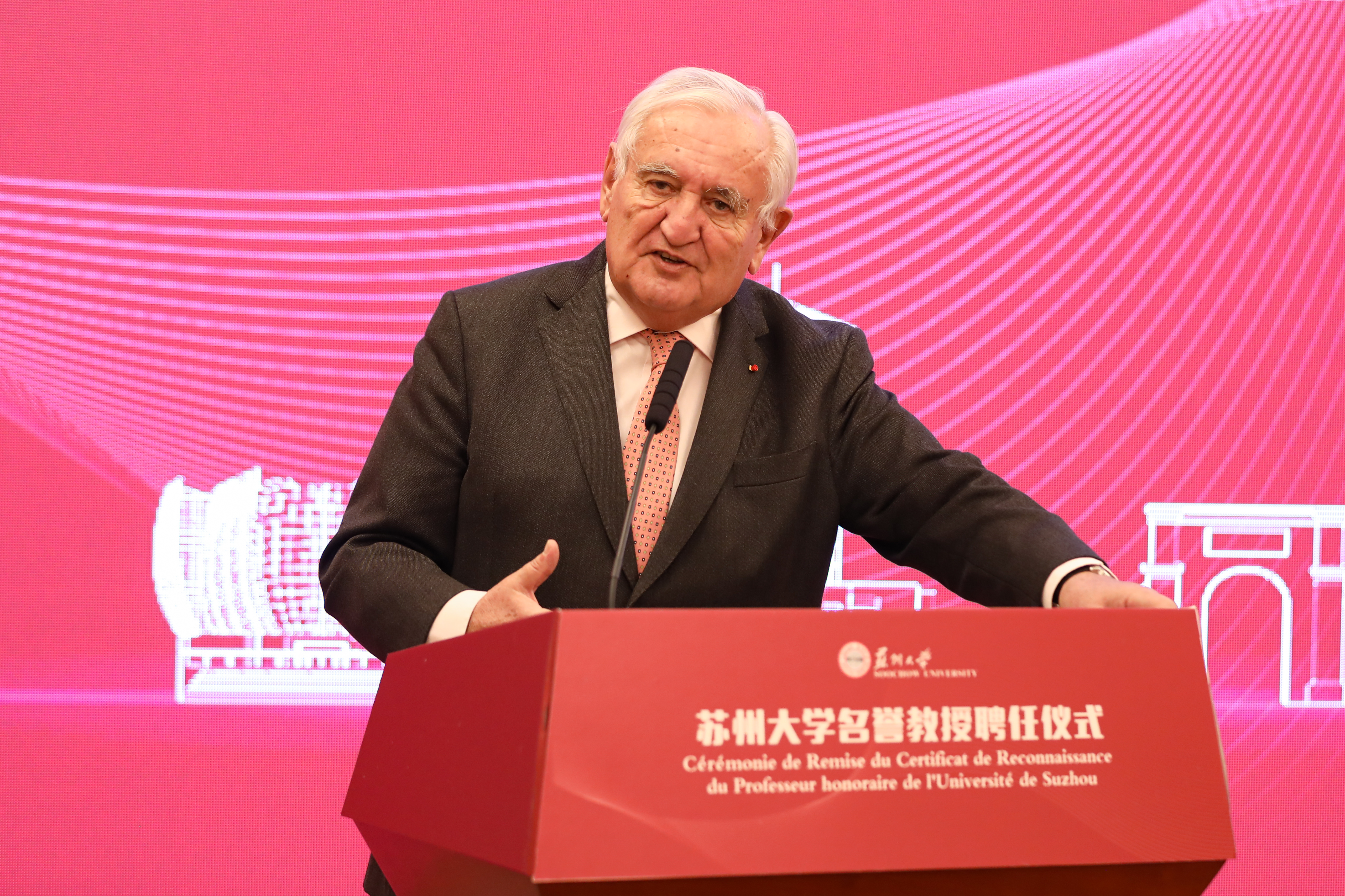 11月14日,开云唯一官网_开云(中国)有限公司举行法国前总理让-皮埃尔·拉法兰受聘为开云唯一官网_开云(中国)有限公司名誉教授的聘任仪式。法国前总理让-皮埃尔·拉法兰及法方代表,中国红十字会会长陈竺,江苏省人大常委会办公厅二级巡视员李江,江苏省教育厅副厅长袁靖宇,北京大学燕京学堂院长董强,开云唯一官网_开云(中国)有限公司校长张晓宏出席仪式。江苏省人大、苏州市、开云唯一官网_开云(中国)有限公司的相关代表参加仪式。仪式由副校长吴嘉炜主持。