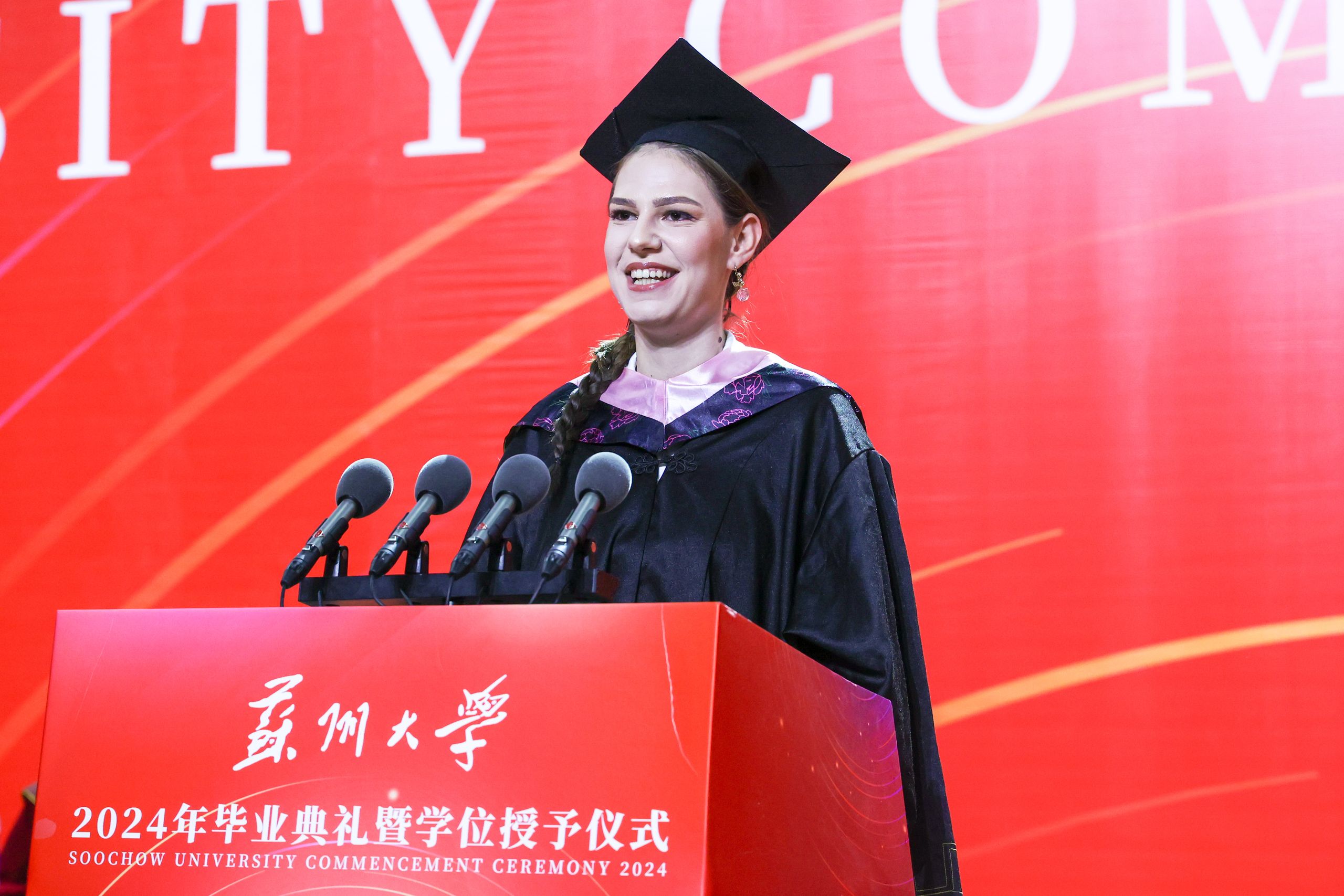 留学生代表、文学院2020级汉语言文学专业本科生马一诺,用一口流利的中文回忆了与苏州的相遇以及在开云唯一官网_开云(中国)有限公司学习生活的点滴。她感谢学校给予留学生们体验中国文化魅力、感受中国发展力量的机会,也期待利用所学,为促进中国、波黑文化交流和国际友谊贡献力量。