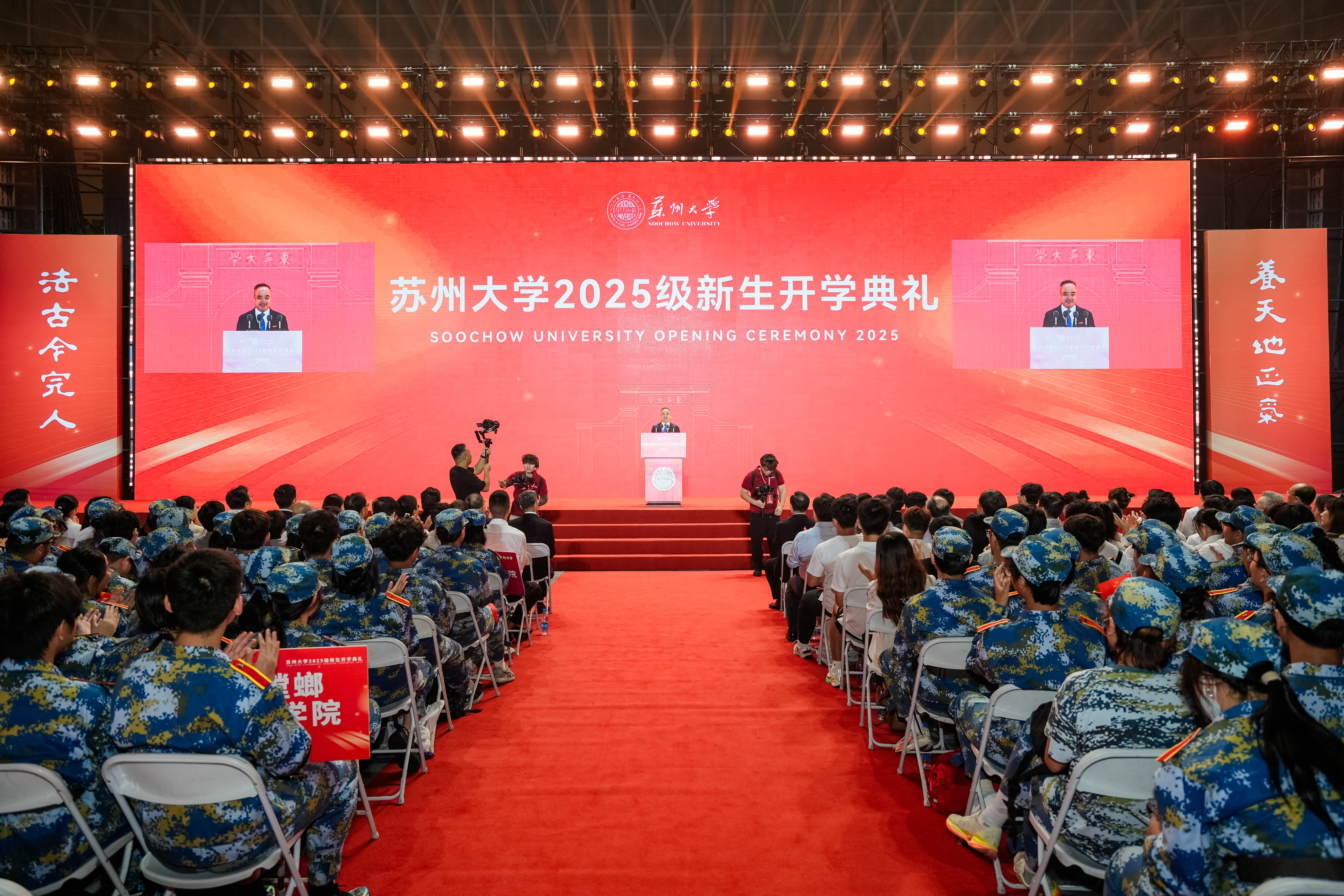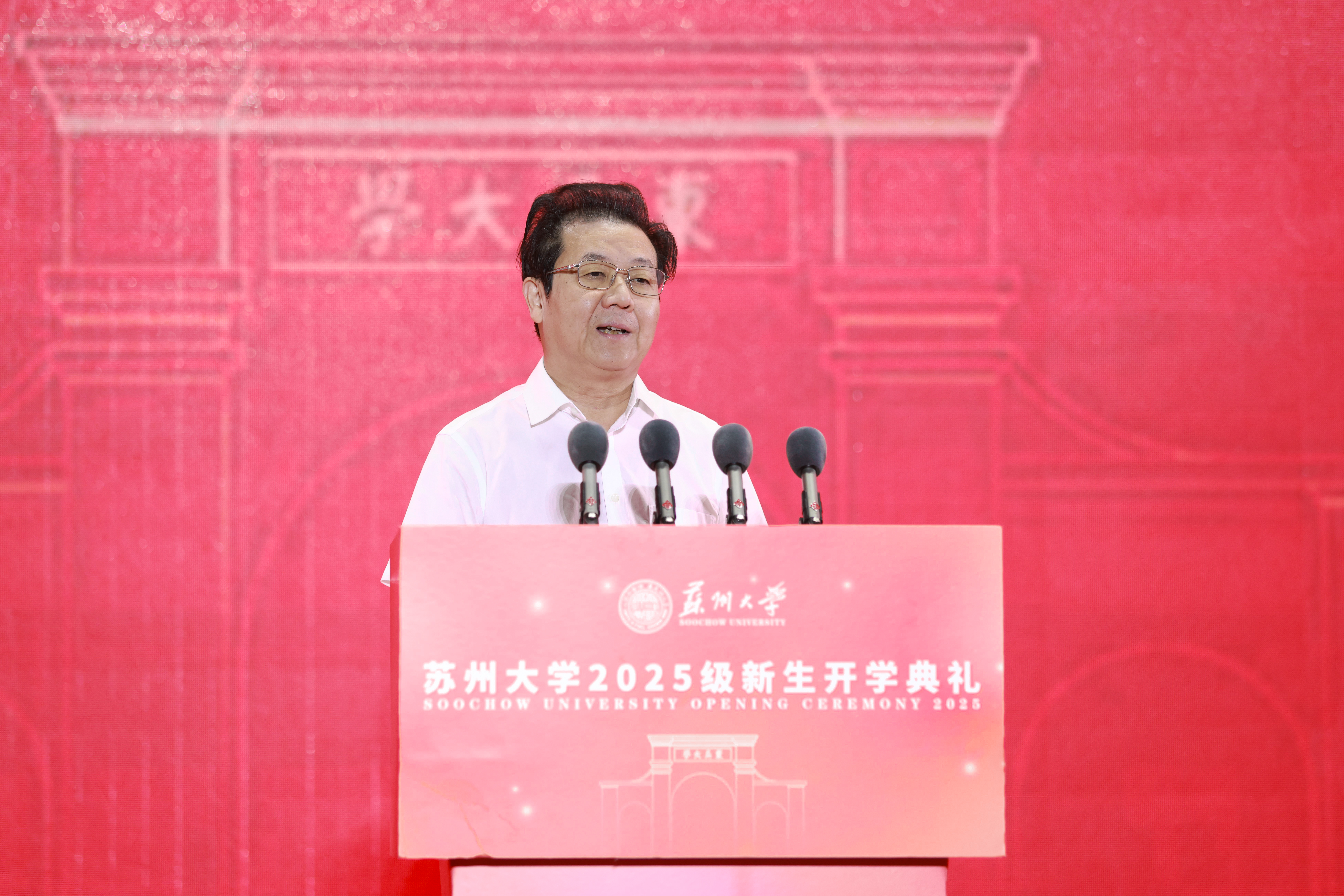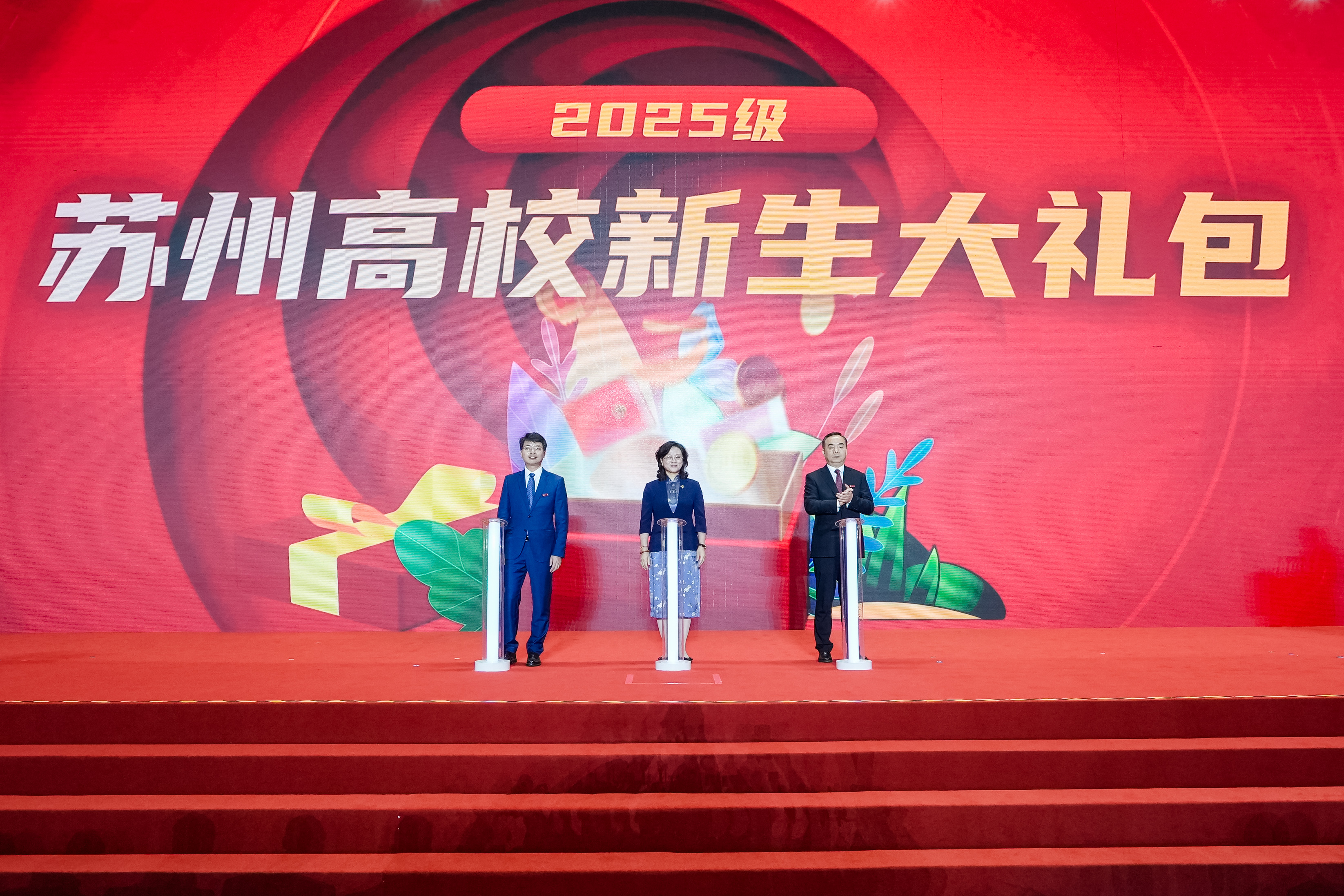 名城育名校,名校润名城。为欢迎2025级新生来到苏州这片热土,苏州市委市政府特别准备了一份满载心意的“新生礼包”。金洁、张晓宏、张桥共同上台开启赠礼。