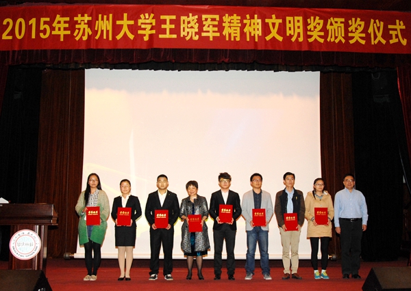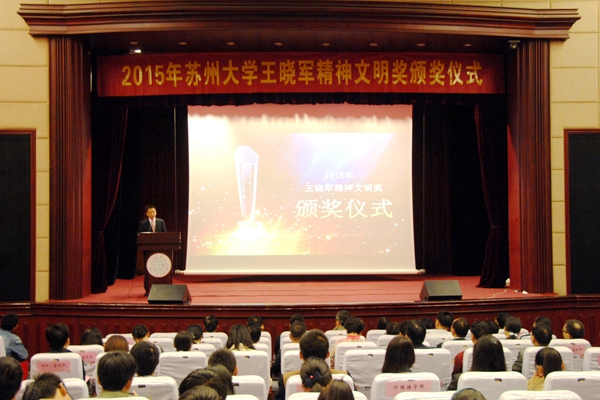 10月28日晚,2015年开云唯一官网_开云(中国)有限公司王晓军精神文明奖颁奖仪式在本部敬贤堂举行。校党委副书记、副校长江作军参加仪式并讲话。王晓军生前在法学院的同班同学、校友代表石荣律师,校精神文明建设领导小组成员单位和各学院(部)的领导及师生代表参加了本次活动。颁奖仪式由党委宣传部副部长吴江主持。