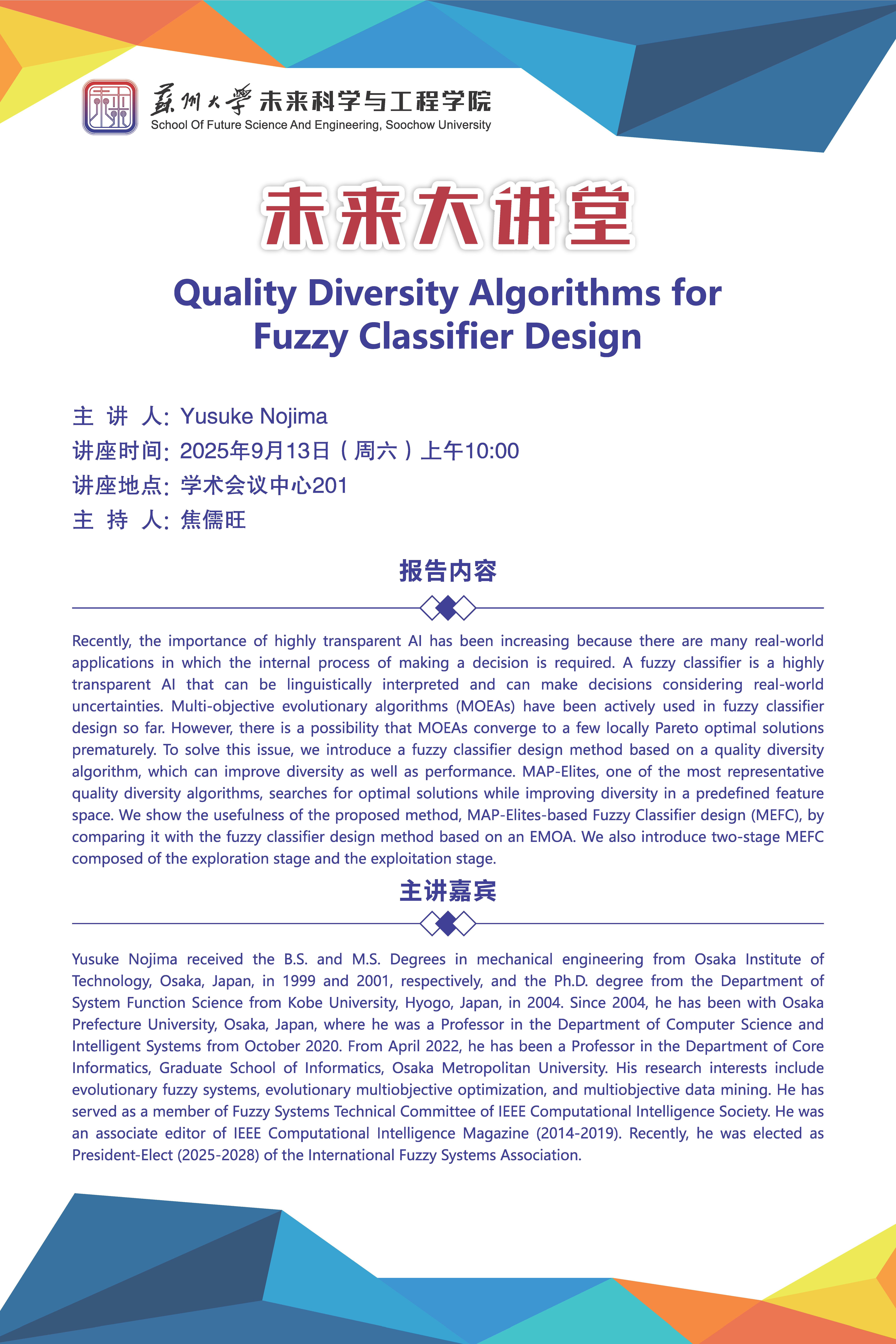 未来科学与工程学院|未来大讲堂:Quality Diversity Algorithms for Fuzzy Classifier Design